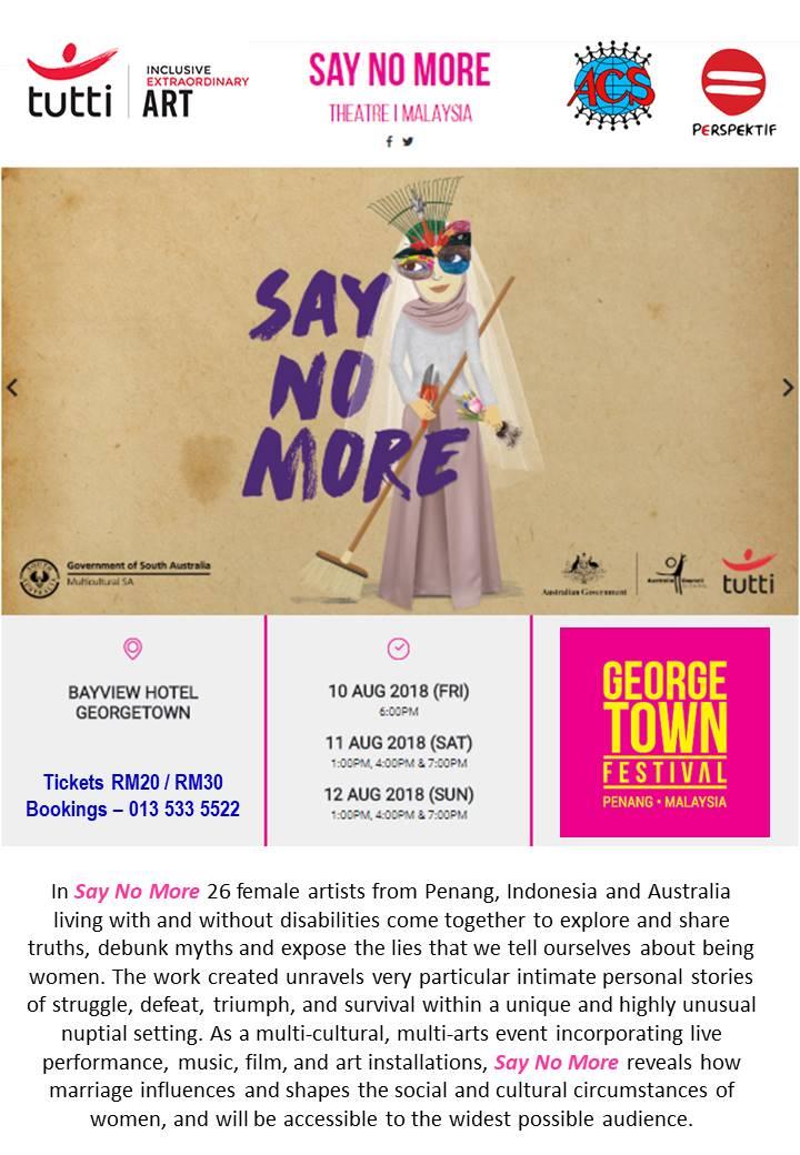 Say No More. A fantastic collaboration with Tutti Arts Australia, Perspektif Indonesia and Stepping Stone Malaysia. Meet the entire wonderful cast of Say No More with Tutti CEO Pat Rix, Artistic Director Catherine Fitzgerald and George Town Festival Director Joe Sidek. |